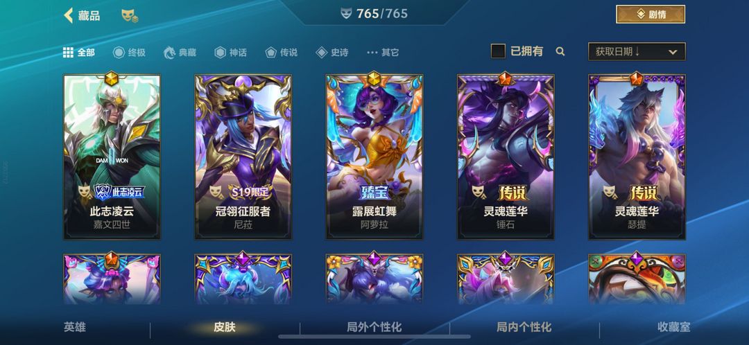 765满皮肤20.8万收藏分✨此致凌云皇子满炫彩✨橙、粉炫彩昵称✨国服收藏10
