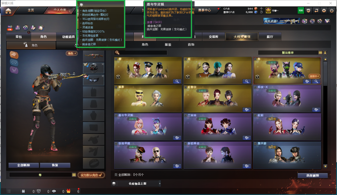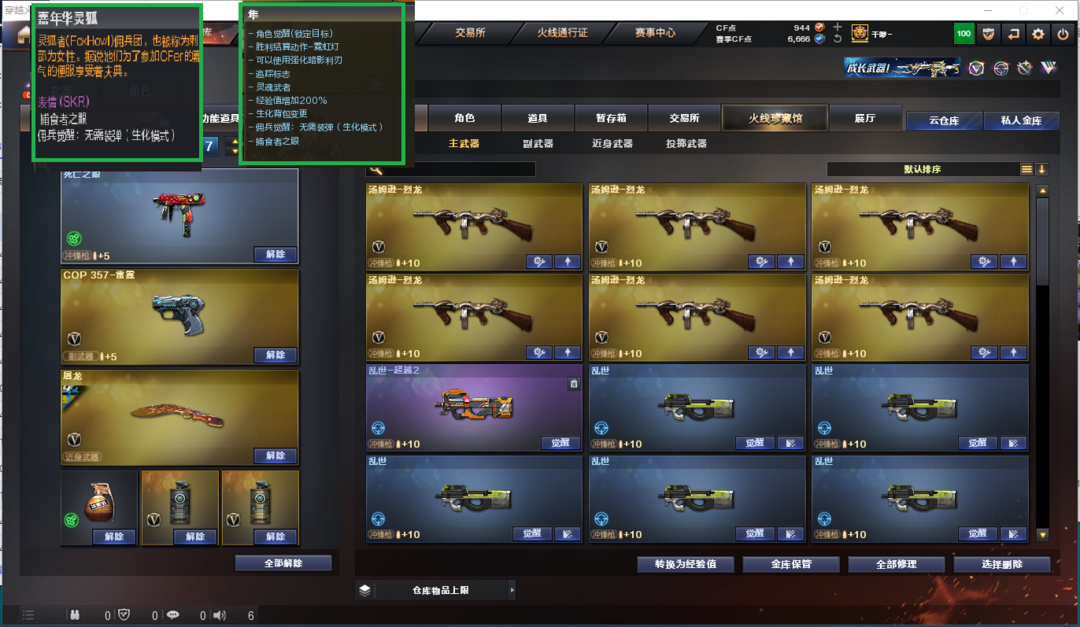装备描述:排位:可以、、、、、、、、生化四防极品:(可以变更背包、查看生化僵尸血量)6烈龙、死亡之眼、超级对讲机、全部弹匣、、、、、、、爆破四防:幻神音效(白鲨皮肤)、2个COP雷霆、白虎、QBZ金色蔷薇、、、幻神音效、黑骑士音效、、、7套雷霆、、、生化人物(隼、嘉年华灵狐)