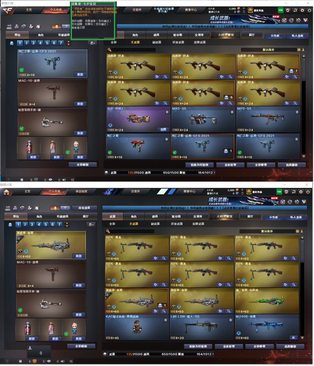 装备描述:排位:可以------------ 生化全装(可以查看僵尸血量)无需换弹、6烈、6盘龙、3炼狱、死亡之眼、MAC手枪、手斧镜、生化减速雷、超级对讲机、全部弹匣