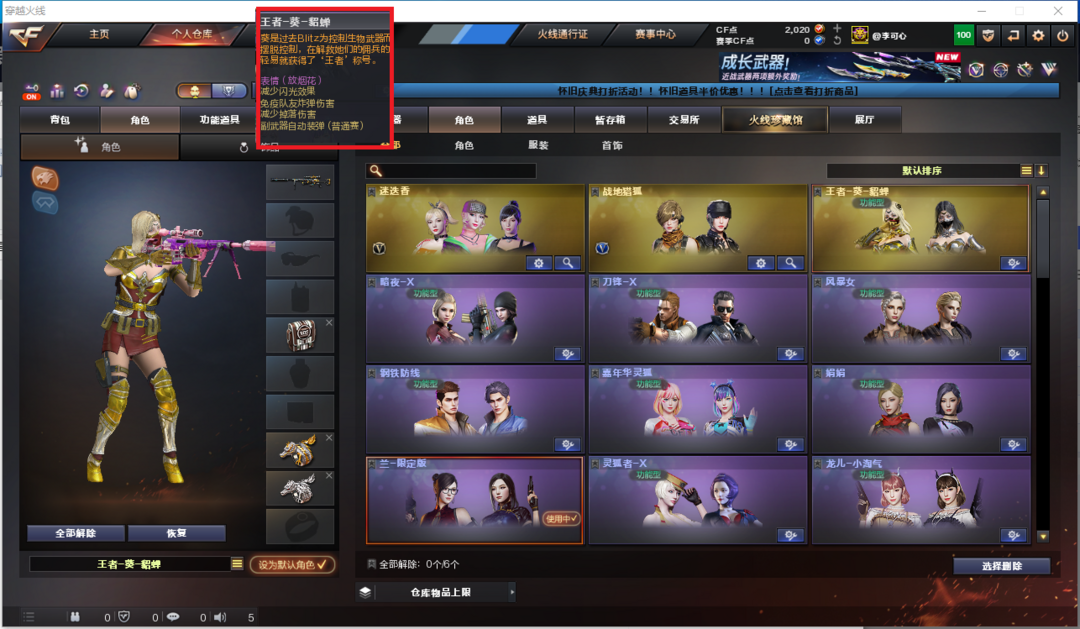 装备描述:排位:可以、、、、、、、 、、、、爆破四防:幻神3皮+音效(宠儿、N9、黄忠皮肤)、冠军之特、玄豹左轮、、、、传说暗裔、白虎玄豹、QBZ金色蔷薇、王者蔷薇、、、幻神音效、裁决音效、蔷薇音效、雷神音效、毁灭音效、黑骑士音效、、、1套雷暴、6套玄豹、1套雷暴王者、、、、爆破四防(王者貂蝉)
