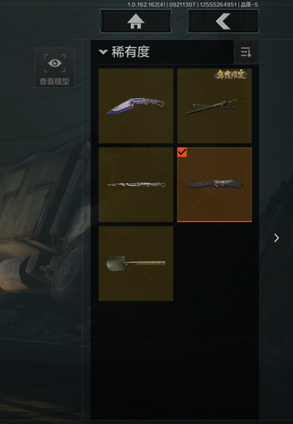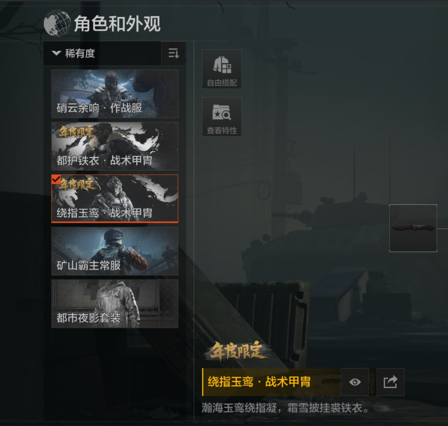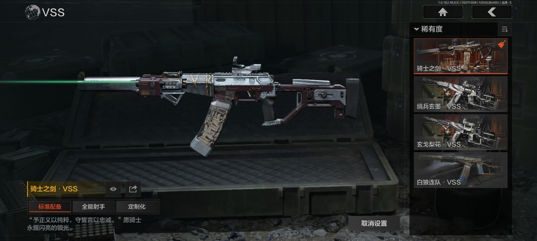 装备描述:瀚星斩铁,三尺万仞战术剑,盘牙彻甲短刃,野战折刀,工兵铲,玉鸾挂枝手套,角弓得控手套;长缨风掣RPK16,长缨风掣AX50,骑士之剑SJ16,滑雪季莫辛,数码猎人M24,骑士之剑VSS,缟兵玄墨VSS,玄戈梨花VSS,白狼连队VSS,骑士之剑MK14,快乐游戏M110,长缨风掣Vector9,湖冰倒影MP5,快乐游戏MPX,缟兵玄墨MPX,玄戈梨花MPX,森林迷彩,竞技FAL,缟兵玄墨AKM,历战AKM,炎夏浪花H416,快乐游戏H416,骑士之剑AKS74U,玉鸾挂枝,都护铁衣战术甲胄,散海花2,瀚海军行,散海花,瀚海军行2,硝云余响,都护铁衣装备组合包,绕指玉鸾战术甲胄,矿山霸主,白狼连对,