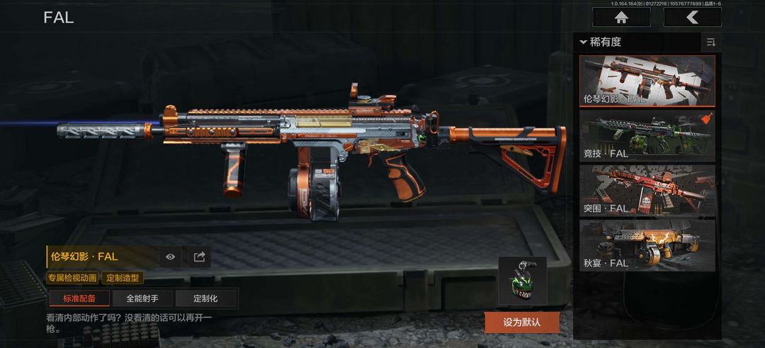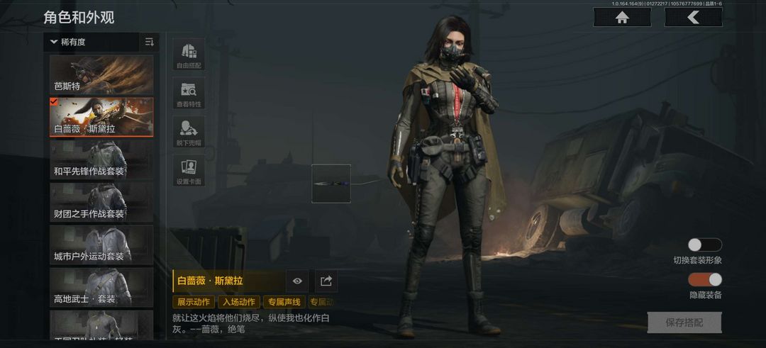 装备描述:芭斯特,白蔷薇斯黛拉,台风IV竞技运动服; 玉擎天工MP5,伦琴幻影FAL,竞技FAL,告丧夜曲AR57,旧王圣谕QBZ191,来战AKM,竞技M4A1,突围FAL,