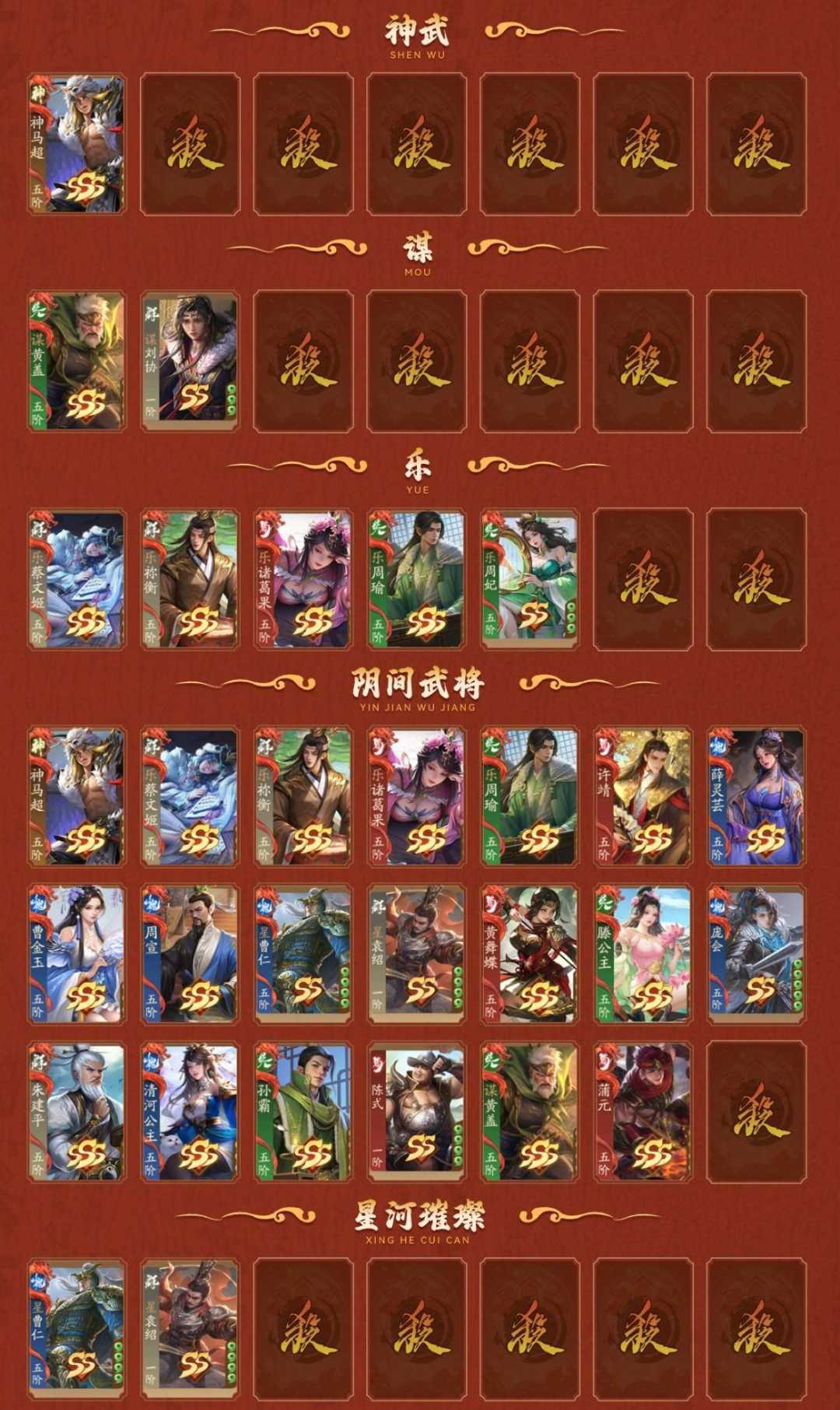 装备描述:神马超,乐蔡文姬(动),乐祢衡,乐诸葛果,乐周瑜,许靖(动),薛灵芸,曹金玉,周宣,星曹仁,星袁绍(动),黄舞蝶,庞会,朱建平,清河公主,孙霸,陈式,谋黄盖,蒲元(静) ; [神武]:神马超;[谋]:谋黄盖,谋刘协;[乐]:乐蔡文姬(动) ,乐祢衡,乐诸葛果,乐周瑜,乐周妃; [星河] :星曹仁,星袁绍(动) ; [SSS] :神马超,许靖(动),周宣,朱建平,谋黄盖,蒲元(静),全惠解,夏侯霸(动),皇甫嵩(动),王双,诸葛恪,诸葛果,辛宪英,来莺儿(静),杨仪,张宝,司马徽,葛玄,高览,大乔小乔,SP马超,SP赵云(动),左慈,神周瑜,神诸葛亮,神曹操,神吕布,神赵云,神司马懿,神刘备,神陆逊,神张辽,神甘宁,张琪瑛; [SS] :星曹仁,星袁绍(动),陈式,刘巴,李异谢旌,李采薇(静),陈玮,刘永,羊祜,华歆,文钦,崔琰毛玢,董白,孙鲁育,孔融,马日殫,张勋,刘虞,田丰,吕范,吴班,张翼,蒋琬费祎,何进,杜夫人,卞喜,贾充,忙牙长,许贡,阚泽,侯成,郭汜,樊稠,张济,唐姬,李催郭汜,邢道荣,曹性,淳于