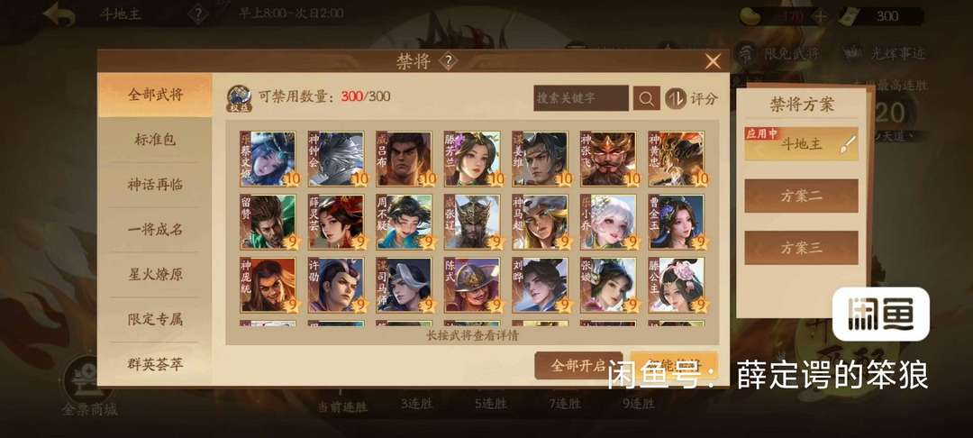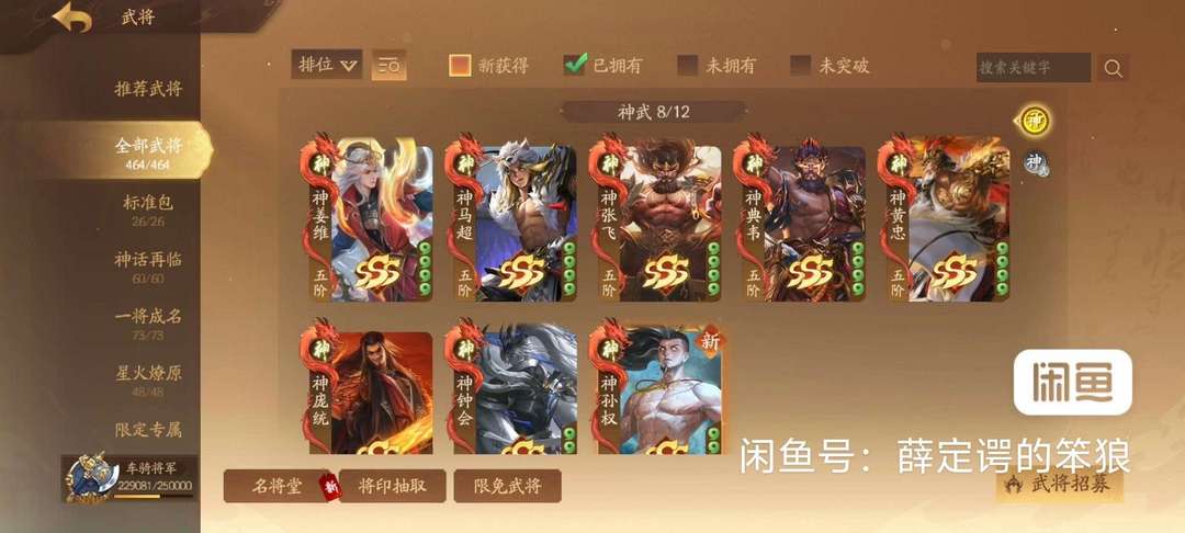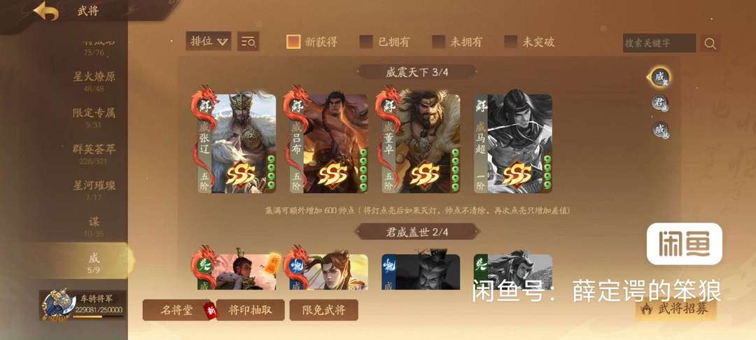 8神车骑神张飞,神马超,神典韦,神孙权,神庞统,神黄忠,神钟会 5威:威张辽威吕布威曹丕威董卓威孙权