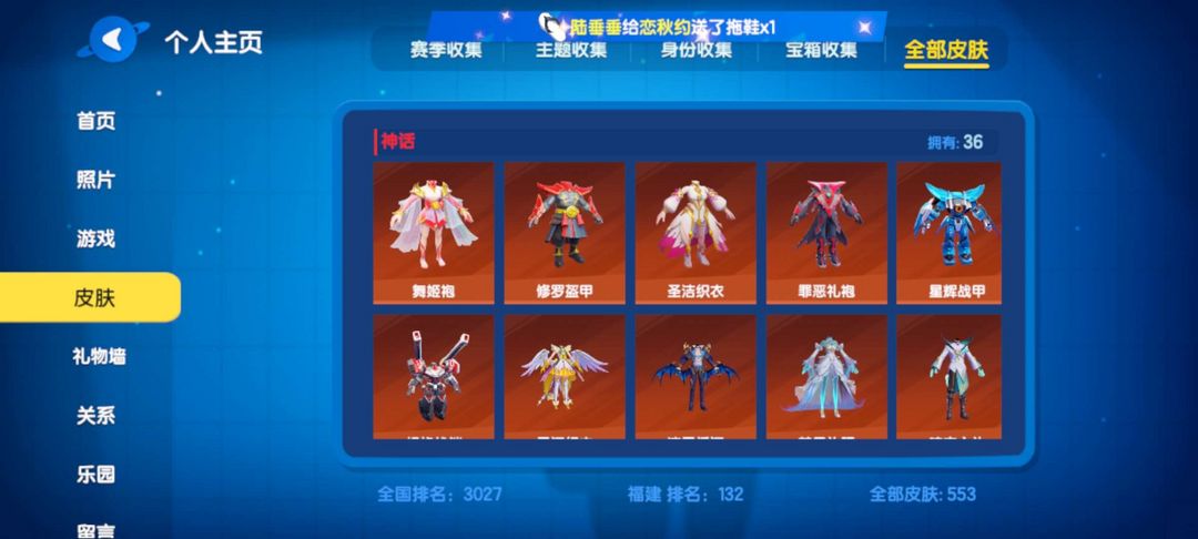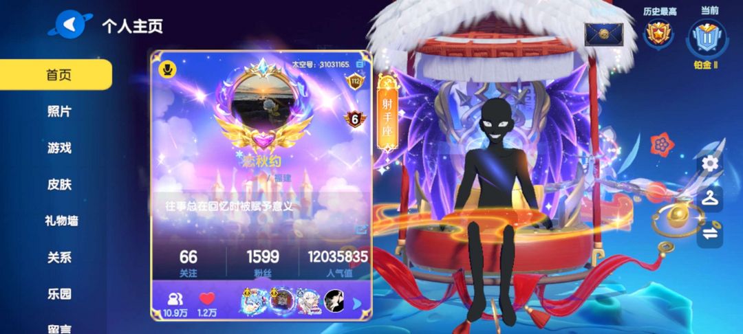 贵族十极品账号,千万人气,三十六个神话,雪山登顶,有绝版破空星翼和小黑,身份皮几乎全满