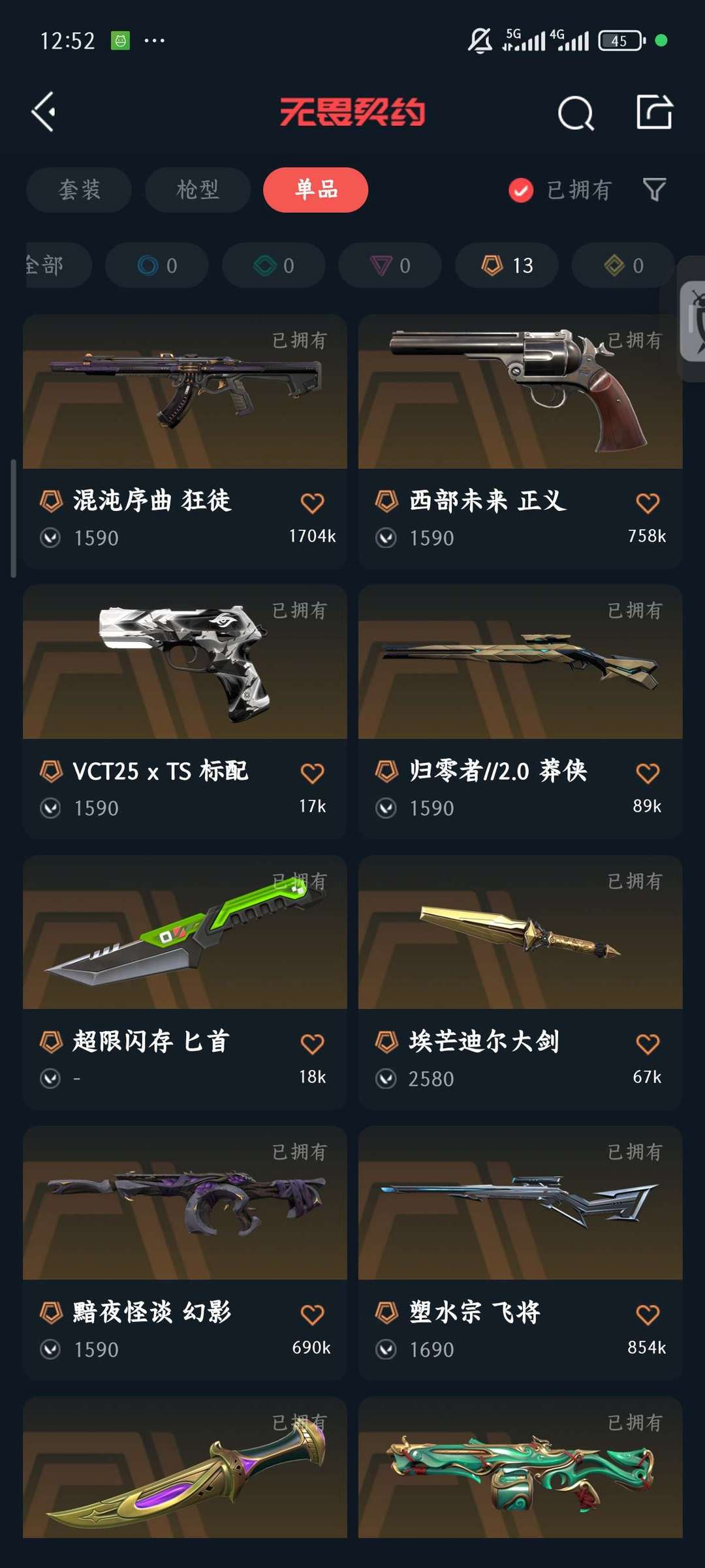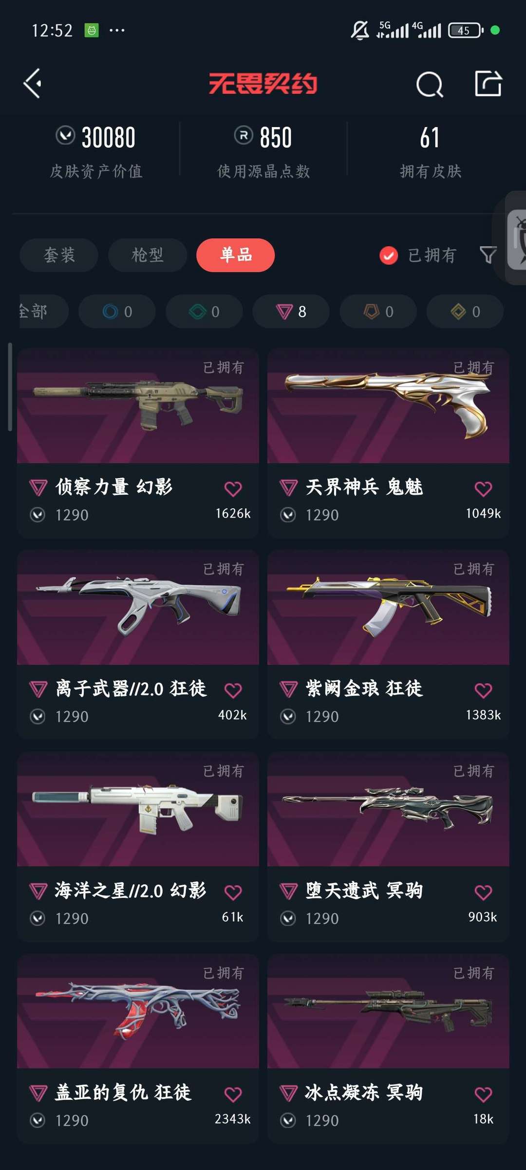 装备描述:狂徒常用皮,盖亚 紫金 混沌 都有 幻影 古神 鱼缸 侦查 大狙 堕天遗物 基本所有武器都有皮肤