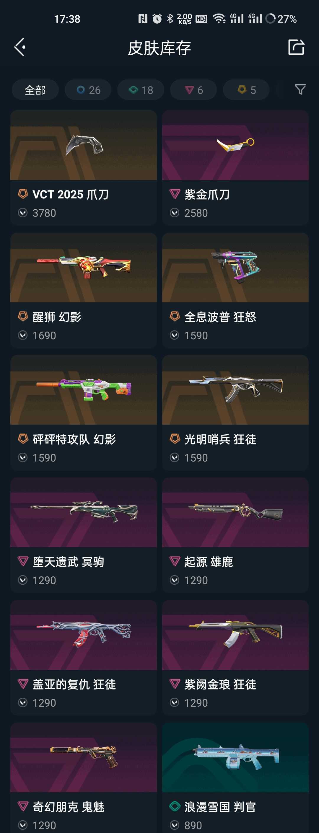 观察期VCT爪刀⭐紫金爪刀⭐盖亚狂徒紫金狂徒⭐光明哨兵狂徒⭐醒狮砰砰幻影⭐堕天遗武冥驹⭐起源雄鹿⭐全