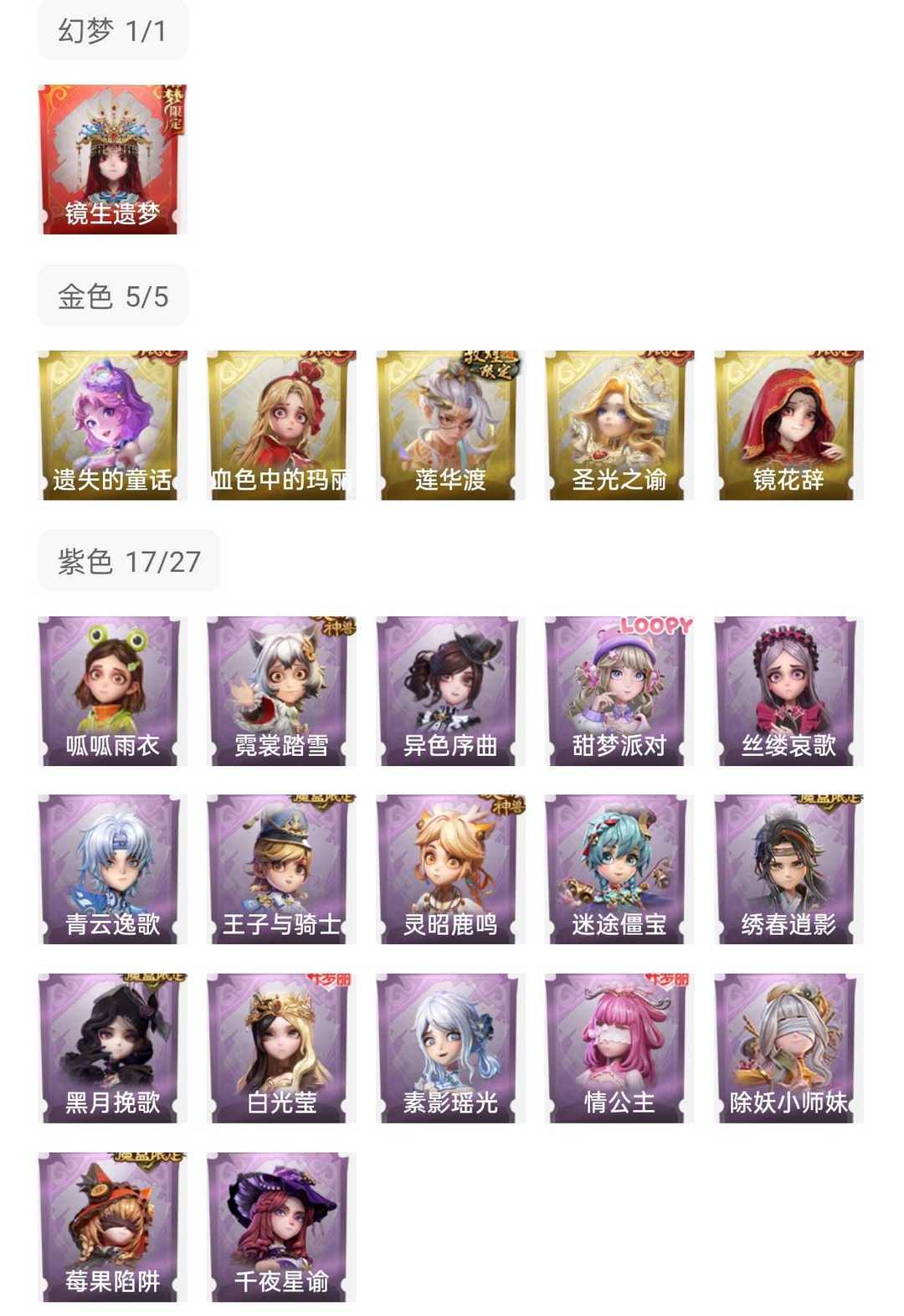 装备描述:【自带铲铲币号宝物一单一卖,每个订单结束都会上号检查铲铲币之后把宝物卖完在上架。尽量保证号都有铲铲币给大家用,请大家别浪费,铲铲币数量一单一查,发现恶意浪费和只花不赚不摸金的永久拉黑,良好的游戏体验靠大家维持,感谢大家的配合和理解,祝宝子们游戏愉快!】 【累计充值42310⭐1红6金17紫皮⭐红皮+满抽镜花辞道具全有凤鸣九天⭐晶澜灵翼⭐渡鸦公爵⭐满抽逍遥金皮⭐绝版薇薇安金⭐满抽小黄金⭐绝版爱丽丝金⭐暗夜小恶魔⭐家园梦居10级⭐】【段位】超自然传说 【幻梦皮肤数量】1 【金色皮肤数量】6 【紫色皮肤数量】17 【道具皮肤数量】44 【铲铲币】2w 【累充】42310金砖 【幻梦皮肤】巫铃儿-镜生遗梦 【金色皮肤】零-渡鸦公爵、逍遥-莲华渡、薇薇安-圣光之谕、爱丽丝-血色中的玛丽、小黄-遗失的童话、巫铃儿-镜花辞 【紫色皮肤】兰-千夜星谕、爱丽丝-甜梦派对、莉莉-莓果陷阱、小黄-异色序曲、阿念-迷途僵宝、莉莉-除妖小师妹、薇薇安-黑月挽歌、阿念-王子与骑士、莉莉-情公主、薇薇安-白光莹、阿念-灵昭鹿鸣、小黄-霓裳踏雪、零-青云逸歌、巫铃儿-素影瑶光、爱丽丝-丝缕哀歌、逍遥-绣春逍影、小黄-
