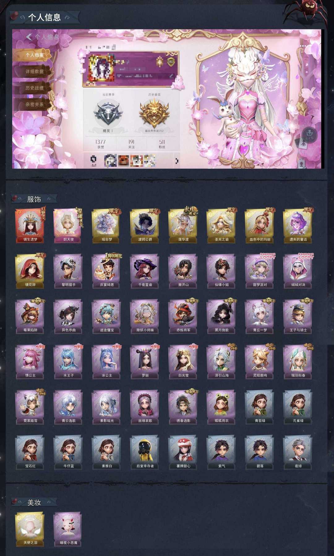 限制: 租号5次及以上 | 撤单率<30%才可租用此帐号装备描述:❗已设置二级密码(不设也会被个别租客设置),无法出售金色回收物(金色以下可以卖),如果币不够可以把金给队友让队友买装备,介意勿下单 ⭐可以叫号主上号卖东西:游戏内搜索 拾趣,看个性签名,长租可以给二级密码 安卓ios均可登录,恶意撤单、用金砖、改id、恶意发言等不文明行为永久拉黑 ✨一单一密保证中途不会挤号,祝游戏愉快~ ⚠️禁止使用外挂、恶意发言、用号行骗,若因此类行为导致禁言、封号的,平台提取租客实名地址,必定会立案追责,并根据账号价值全额赔偿。 账号情况: 星耀炽天使/幻梦镜生遗梦池子满抽 6金皮:血色中的玛丽/遗失的童话/圣光之谕/莲华渡/镜花辞/渡鸦公爵 s1-s7魔盒:青丘一梦 赤炼将军 黑月挽歌 王子与骑士 绣春逍影 莓果陷阱 黎明猎手 故宫:瑞羽衔春 泽引山海 霓裳踏雪 灵昭鹿鸣 青花瓷:素影瑶光 青云逸歌 叶罗丽:情公主 冰公主 白光莹 罗丽 水王子 捉妖奇妙夜:迷途僵宝 除妖小师妹 赞萌露比联动时装:绒绒对决 甜梦派对 非遗傩戏:搬开山 先锋小姐 小鲨刺刀/小狗蛇点点鞭/卡皮巴拉铲/赞萌露比水枪、心跳眼镜、珍珠芭乐莓莓、赞萌