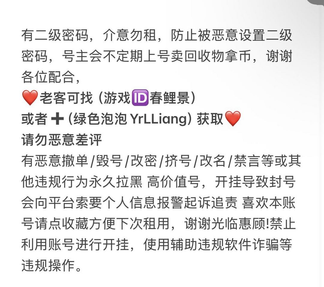 限制: 租号6次及以上 |装备描述:有二级密码,介意勿租,防止被恶意设置二级密码,号主会不定期上号卖回收物拿币,谢谢各位配合,请勿恶意差评 有恶意撤单/毁号/改密/挤号/改名/禁言等或其他违规行为永久拉黑 高价值号,开挂导致封号会向平台索要个人信息报警起诉追责 喜欢本账号请点收藏方便下次租用,谢谢光临惠顾!禁止利用账号进行开挂,使用辅助违规软件诈骗等违规操作。