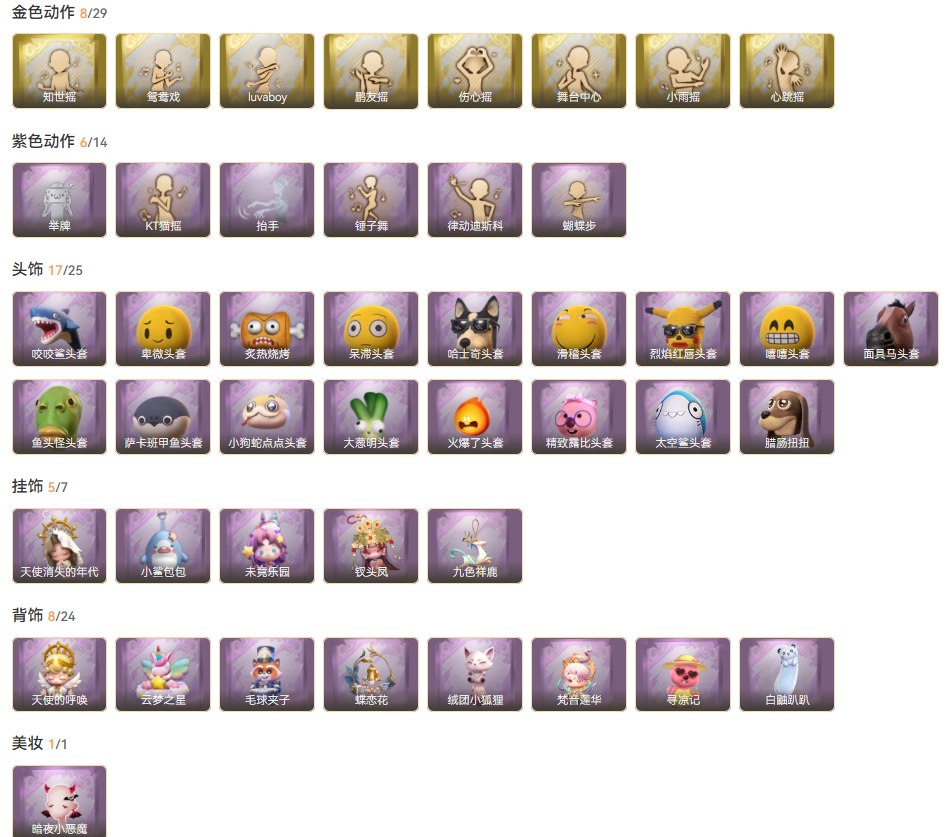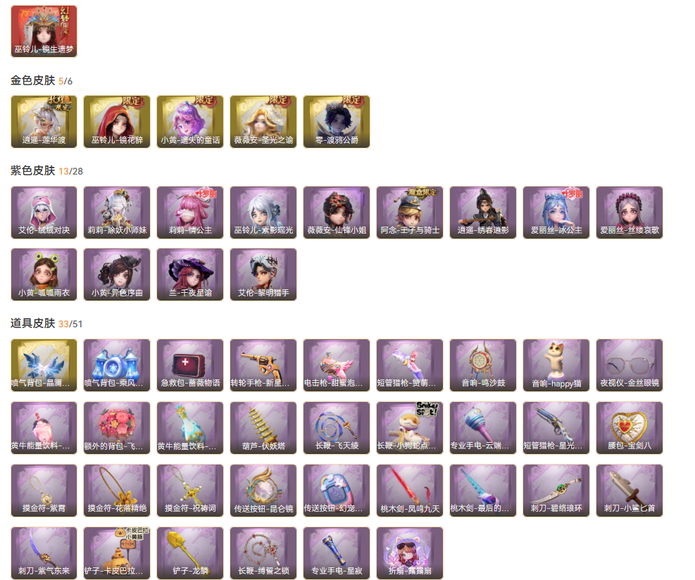 装备描述:红皮1;金皮5;紫皮13;道具皮33;皮肤:巫铃儿-镜生遗梦,逍遥-莲华渡,零-渡鸦公爵,小黄-遗失的童话,薇薇安-圣光之谕,巫铃儿-镜花辞,艾伦-黎明猎手,巫铃儿-素影瑶光,艾伦-绒绒对决,兰-千夜星谕,小黄-呱呱雨衣,小黄-异色序曲,莉莉-除妖小师妹,逍遥-绣春逍影,莉莉-情公主,爱丽丝-冰公主,薇薇安-仙锋小姐,爱丽丝-丝缕哀歌,阿念-王子与骑士;道具:喷气背包-晶澜灵翼,黄牛能量饮料-青玉抱丹,桃木剑-最后的独角兽,刺刀-小鲨匕首,折扇-露露扇,喷气背包-乘风溯雪,短管猎枪-星光的裁决,摸金符-花落精绝,摸金符-祝祷词,桃木剑-凤鸣九天,专业手电-云端梦想计划,转轮手枪-新星时代,急救包-蔷薇物语,黄牛能量饮料-珍珠芭乐莓莓,夜视仪-金丝眼镜,传送按钮-幻宠之门,长鞭-飞天绫,音响-鸣沙鼓,长鞭-小狗蛇点点鞭,短管猎枪-赞萌露比水枪,铲子-龙鳞,音响-happy猫,刺刀-碧络琅环,葫芦-伏妖塔,额外的背包-飞花令,传送按钮-昆仑镜,腰包-宝剑八,铲子-卡皮巴拉小黄豚铲,长鞭-缚誓之锁,电击枪-甜蜜泡泡枪,摸金符-紫霄,刺刀-紫气东来,专业手电-星寂;美妆:美妆-暗夜小恶魔;饰品