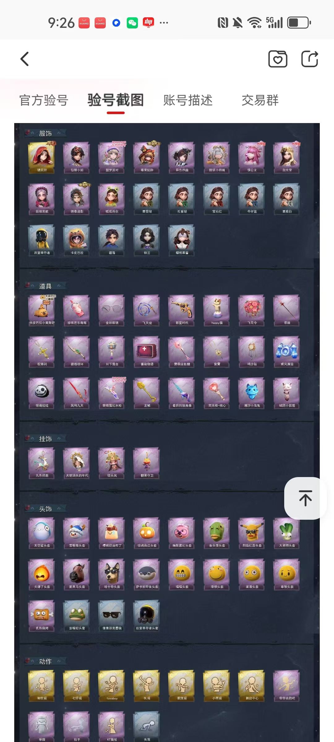装备描述:【金色皮肤】巫铃儿-镜花辞 【紫色皮肤】薇薇安-仙锋小姐、爱丽丝-甜梦派对、莉莉-莓果陷阱、小黄-异色序曲、莉莉-除妖小师妹、莉莉-情公主、薇薇安-白光莹、爱丽丝-丝缕哀歌、逍遥-绣春逍影、小黄-呱呱雨衣 【道具皮肤】铲子-卡皮巴拉小黄豚铲、黄牛能量饮料-珍珠芭乐莓莓、夜视仪-金丝眼镜、长鞭-飞天绫、转轮手枪-新星时代、音响-happy猫、额外的背包-飞花令、摸金符-祝祷词、刺刀-碧络琅环、腰包-月下莲台、急救包-蔷薇物语、铲子-赞萌波板糖、摸金符-紫霄、音响-鸣沙鼓、喷气背包-乘风溯雪、腰包-惊魂娃娃、桃木剑-凤鸣九天、短管猎枪-赞萌露比水枪、铲子-龙鳞、桃木剑-最后的独角兽、背饰-潮汐小海兔 【头饰】太空鲨头套、雪墩墩头套、樱桃奶油布丁、惊魂南瓜头套、精致露比头套、鱼头怪头套、烈焰红唇头套、大葱明头套、火爆了头套、面具马头套、哈士奇头套、萨卡班甲鱼头套、嘻嘻头套、滑稽头套、呆滞头套、卑微头套、炙热烧烤、歪嘴蛙头套、像素朋克墨镜、后室幸存者头套 【挂饰】九色祥鹿、天使消失的年代、钗头凤、糖果守卫 【动作】知世摇、七仔摇、luvaboy、DL摇、鹏友摇、小雨摇、舞台中心、带你逃跑吧、举
