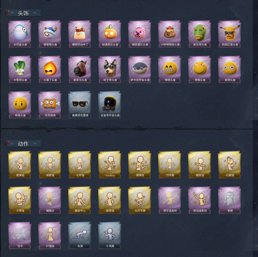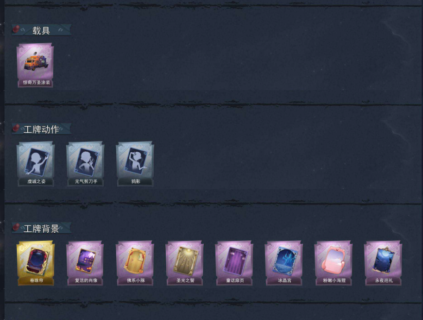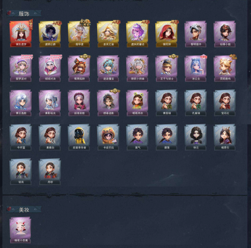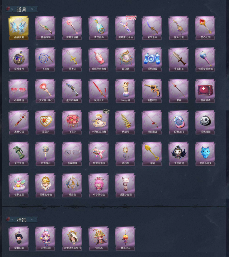 装备描述:【员工】小黄、爱丽丝、零、阿念、逍遥、薇薇安、巫铃儿、莉莉、艾伦、爱德华、兰、小满 【幻梦皮肤】巫铃儿-镜生遗梦 【金色皮肤】零-渡鸦公爵、逍遥-莲华渡、薇薇安-圣光之谕、小黄-遗失的童话、巫铃儿-镜花辞 【紫色皮肤】艾伦-黎明猎手、薇薇安-仙锋小姐、爱丽丝-甜梦派对、艾伦-绒绒对决、莉莉-莓果陷阱、阿念-迷途僵宝、莉莉-除妖小师妹、阿念-王子与骑士、爱丽丝-冰公主、阿念-灵昭鹿鸣、零-青云逸歌、巫铃儿-素影瑶光、爱丽丝-丝缕哀歌、逍遥-绣春逍影、小黄-呱呱雨衣 【道具皮肤】喷气背包-晶澜灵翼、刺刀-碧络琅环、铲子-赞萌波板糖、黄牛能量饮料-青玉抱丹、短管猎枪-赞萌露比水枪、刺刀-紫气东来、除颤仪-弦外之音、铲子-圣心之泪、传送按钮-逆时审判、长鞭-飞天绫、摸金符-祝祷词、黄牛能量饮料-珍珠芭乐莓莓、传送按钮-昆仑镜、喷气背包-乘风溯雪、刺刀-小鲨匕首、专业手电-云端梦想计划、夜视仪-心跳眼镜、短管猎枪-星光的裁决、桃木剑-凤鸣九天、音响-happy猫、转轮手枪-新星时代、急救包-蔷薇物语、急救包-末章心跳、腰包-宝剑八、额外的背包-飞花令、长鞭-小狗蛇点点鞭、葫芦-伏妖塔、桃木剑-绯