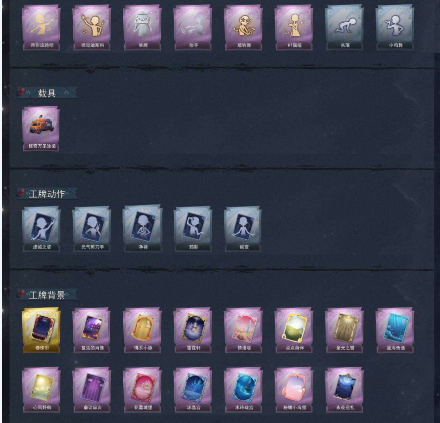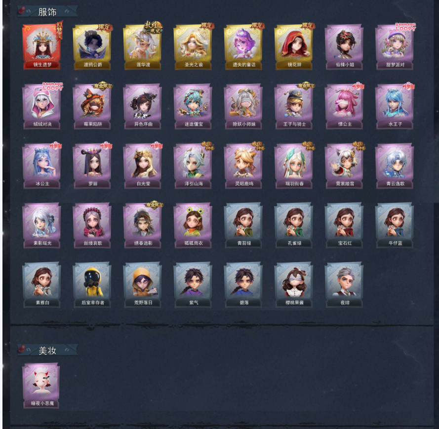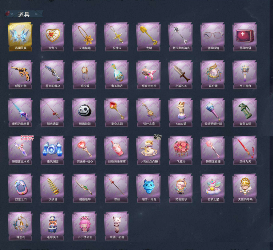 装备描述:【幻梦皮肤】巫铃儿-镜生遗梦 【金色皮肤】零-渡鸦公爵、逍遥-莲华渡、薇薇安-圣光之谕、小黄-遗失的童话、巫铃儿-镜花辞 【紫色皮肤】薇薇安-仙锋小姐、爱丽丝-甜梦派对、艾伦-绒绒对决、莉莉-莓果陷阱、小黄-异色序曲、阿念-迷途僵宝、莉莉-除妖小师妹、阿念-王子与骑士、莉莉-情公主、艾伦-水王子、爱丽丝-冰公主、小黄-罗丽、薇薇安-白光莹、逍遥-泽引山海、阿念-灵昭鹿鸣、爱丽丝-瑞羽衔春、小黄-霓裳踏雪、零-青云逸歌、巫铃儿-素影瑶光、爱丽丝-丝缕哀歌、逍遥-绣春逍影、小黄-呱呱雨衣 【道具皮肤】喷气背包-晶澜灵翼、腰包-宝剑八、摸金符-花落精绝、摸金符-祝祷词、铲子-龙鳞、铲子-撒拉弗的祷告、夜视仪-金丝眼镜、急救包-蔷薇物语、转轮手枪-新星时代、短管猎枪-星光的裁决、音响-鸣沙鼓、黄牛能量饮料-青玉抱丹、电击枪-甜蜜泡泡枪、刺刀-小鲨匕首、传送按钮-昆仑镜、腰包-月下莲台、桃木剑-最后的独角兽、桃木剑-绯色遗证、腰包-惊魂娃娃、铲子-圣心之泪、除颤仪-弦外之音、音响-happy猫、专业手电-云端梦想计划、闪光弹-金戈玄铜、短管猎枪-赞萌露比水枪、喷气背包-乘风溯雪、黄牛能量饮料-珍