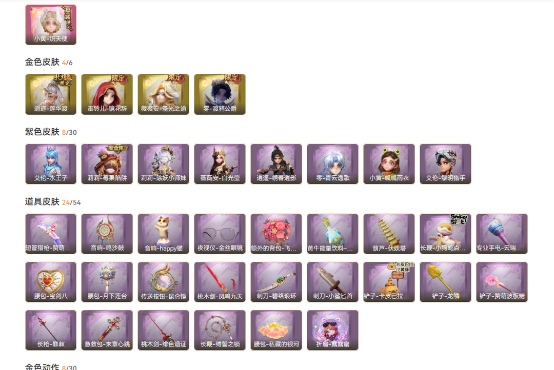 兔宝1星耀4金8紫24道具皮炽天使莲花渡渡鸦公爵圣光之谕镜花辞/除妖小师妹白光莹水王子绣春逍影