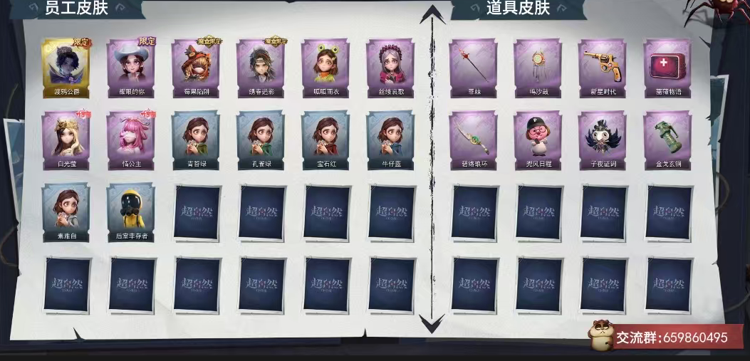装备描述:【金色皮肤】零-渡鸦公爵 【紫色皮肤】爱丽丝-耀眼的你、莉莉-莓果陷阱、莉莉-情公主、薇薇安-白光莹、爱丽丝-丝缕哀歌、逍遥-绣春逍影、小黄-呱呱雨衣 【道具皮肤】急救包-蔷薇物语、音响-鸣沙鼓、转轮手枪-新星时代、闪光弹-金戈玄铜、刺刀-碧络琅环、背饰-子夜证词、背饰-兜风日程