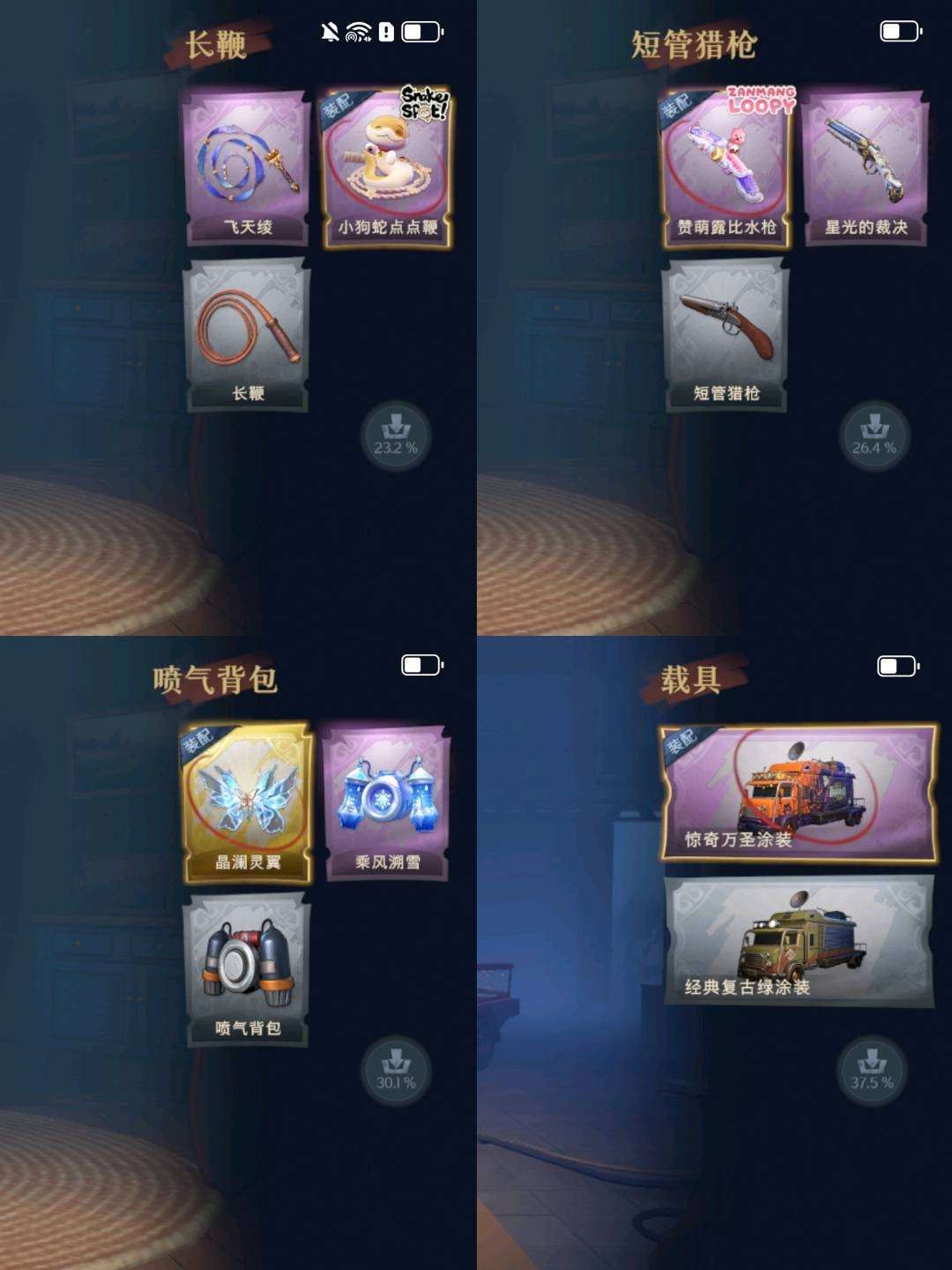 装备描述:【幻梦皮肤】巫铃儿-镜生遗梦 【金色皮肤】逍遥-莲华渡、薇薇安-圣光之谕、小黄-遗失的童话、巫铃儿-镜花辞 【紫色皮肤】薇薇安-仙锋小姐、爱丽丝-甜梦派对、艾伦-绒绒对决、莉莉-莓果陷阱、小黄-异色序曲、阿念-迷途僵宝、莉莉-除妖小师妹、阿念-王子与骑士、莉莉-情公主、零-青云逸歌、巫铃儿-素影瑶光、爱丽丝-丝缕哀歌、逍遥-绣春逍影、小黄-呱呱雨衣 【道具皮肤】喷气背包-晶澜灵翼、摸金符-紫霄、腰包-月下莲台、刺刀-碧络琅环、急救包-蔷薇物语、短管猎枪-星光的裁决、葫芦-伏妖塔、短管猎枪-赞萌露比水枪、腰包-惊魂娃娃、铲子-圣心之泪、黄牛能量饮料-青玉抱丹、传送按钮-昆仑镜、额外的背包-飞花令、传送按钮-幻宠之门、音响-鸣沙鼓、铲子-龙鳞、摸金符-祝祷词、铲子-赞萌波板糖、刺刀-小鲨匕首、腰包-宝剑八、长鞭-飞天绫、转轮手枪-新星时代、喷气背包-乘风溯雪、音响-happy猫、电击枪-甜蜜泡泡枪、桃木剑-凤鸣九天、夜视仪-金丝眼镜、长鞭-小狗蛇点点鞭、夜视仪-心跳眼镜、背饰-蜜蜂线索、背饰-潮汐小海兔、背饰-梵音莲华、背饰-云梦之星、背饰-天使的呼唤、背饰-蝶恋花、背饰-毛球夹子 【美