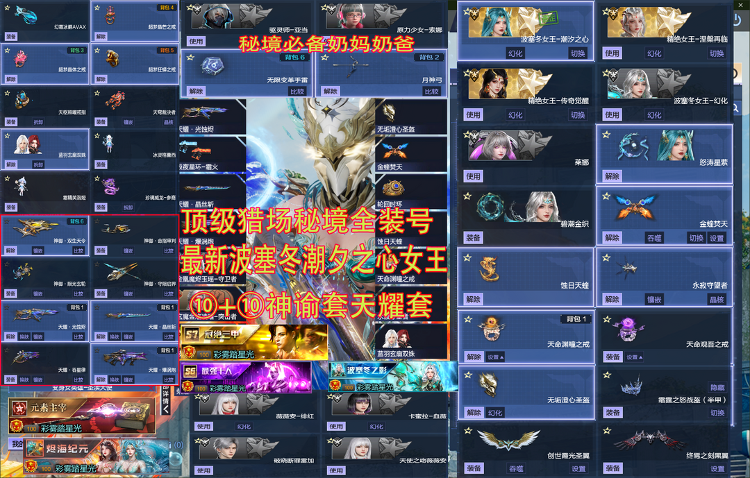 限制: 租号1次及以上 | 撤单率<40%才可租用此帐号装备描述:禁止PVP打了必投诉拉黑〖✅〖安全模式可帮解除,点上号器的连系号主发安全码 等待会即可〗【新图增伤三件套满聚合红战术,秘境964基础伤害99关,无限变革雷,奶妈,双金能量再生无限飞 | 45星神武 | 〗【✅新增道具】:双色冰火翼,波塞冬女王-潮夕之心,精绝女王-涅槃再临,蚀日天蝰碧潮金织/怒涛星萦〖返利拉满,神谕套全核心,元初双极羽翼,天命渊瞳戒,波塞冬女王-幻化〗跃火烛台-巡山印,崩解者-方圜阵〖最新增伤角色:莱娜 | 天命观吾之戒〗塔防伴生灵冰灵霜精丨升级合体蓝雨玄扇双姝伴生灵冰雪皇冠霜霆之怒战盔✨五蜉灵天耀全套满配✨超梦晶体戒✨超梦晶芒戒天耀+返利翅膀✨新守护天穹裁决者 | 最新制服6角色拉满 | 天枢独角兽战盔 | 幻霜冰爵跑车 | 影刃潜灵三臂铠〖更新后到仓库→山海套+星寰套全套联动皮肤+宠物皮肤,英雄掘金,英雄画灵-银羽〗新战甲皮肤腾风-影涟龙威改|绀蓝套|奥特曼六件套|黑翼|魔鲲羽翼,暗星黑冕 | 全套史诗:星寰|山海|幻海|幻域|神凰|天帝六核|陨星|天启/七神武|元素|诸神|魔鲲|天鲲|创世|
