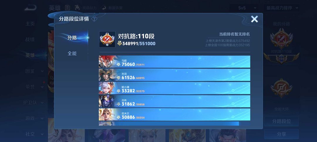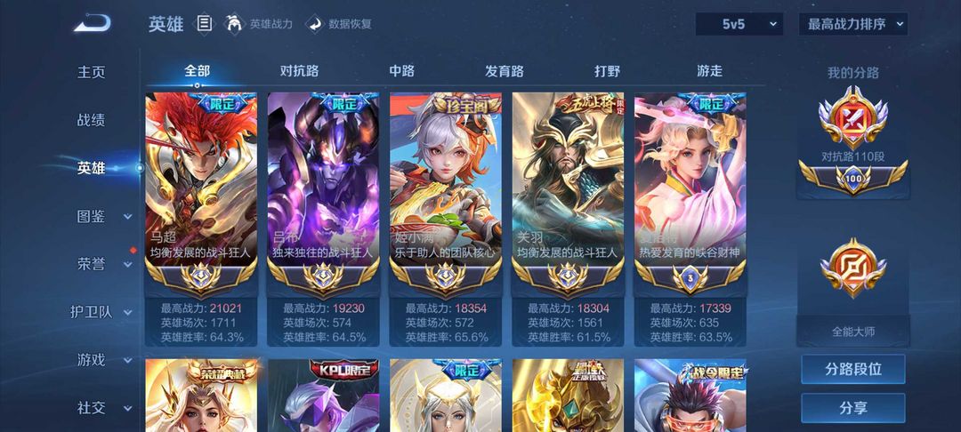 110段对抗路⭐2w1国服马超关羽吕布姬小满⭐v10贵族皮肤共享⭐可排