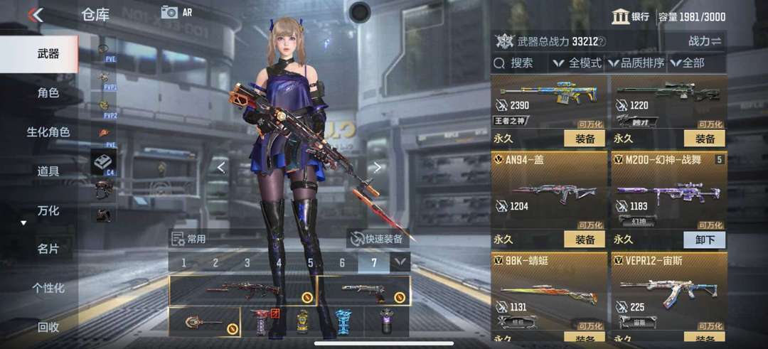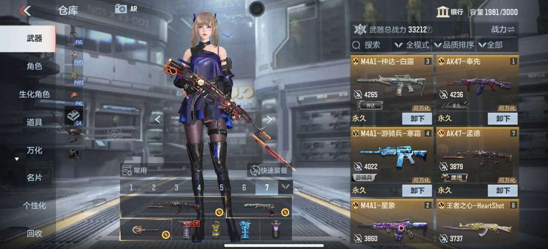 装备描述:星象 奉先 孟德套 仲达白露 m4游骑兵冰皮 盖 仲康 妙才 生化有王蝶6烈龙 宙斯 有两把辅秒狙