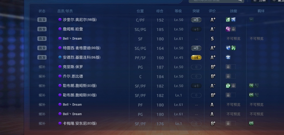 装备描述:妙传5神射4火烫4闪电4好斗暴扣全对领袖禁区霸主3。。自建三技能:隔扣射手突破4..里德马丁投。威少沃尔科比上。 乔丹扣。 希望玩的朋友攒点精华换奥尼尔搞橙卡。谢谢