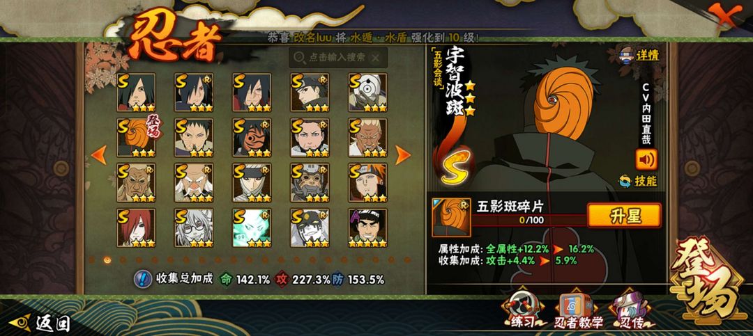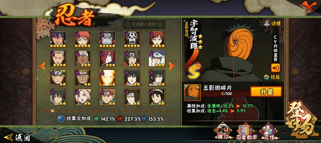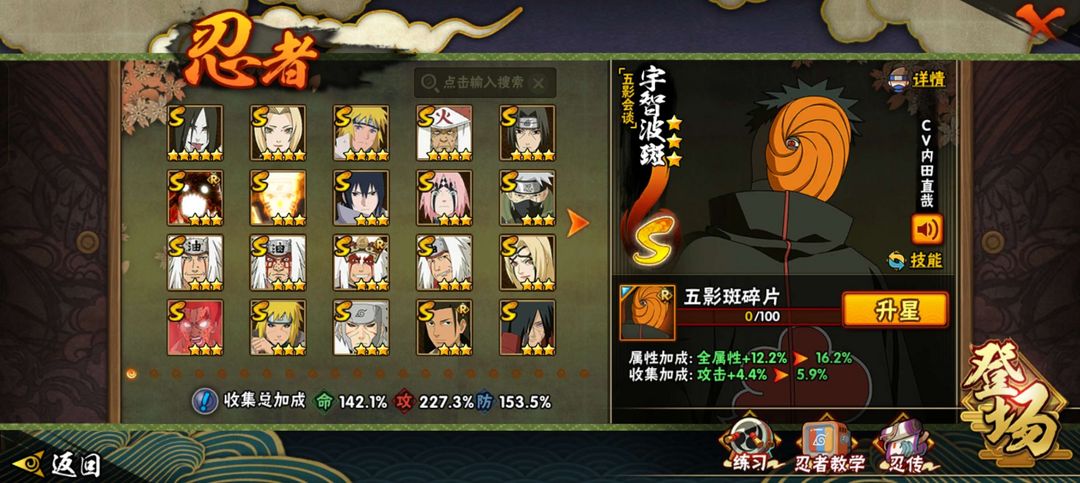 战力2262W★39s★51A★五影斑★六尾★舍人★桃式★须水★大野木★创柱★创斑★半藏★无★三雷