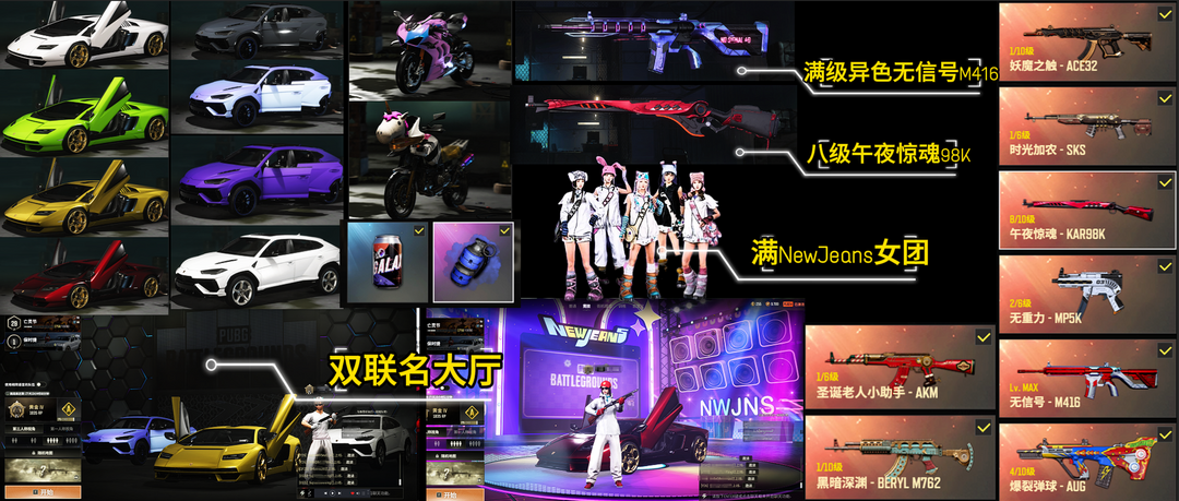 【9神器】双大厅✨满NewJeans女团✨满兰博✨粉杜卡迪✨满级异色无信号M416✨8级午夜惊魂98