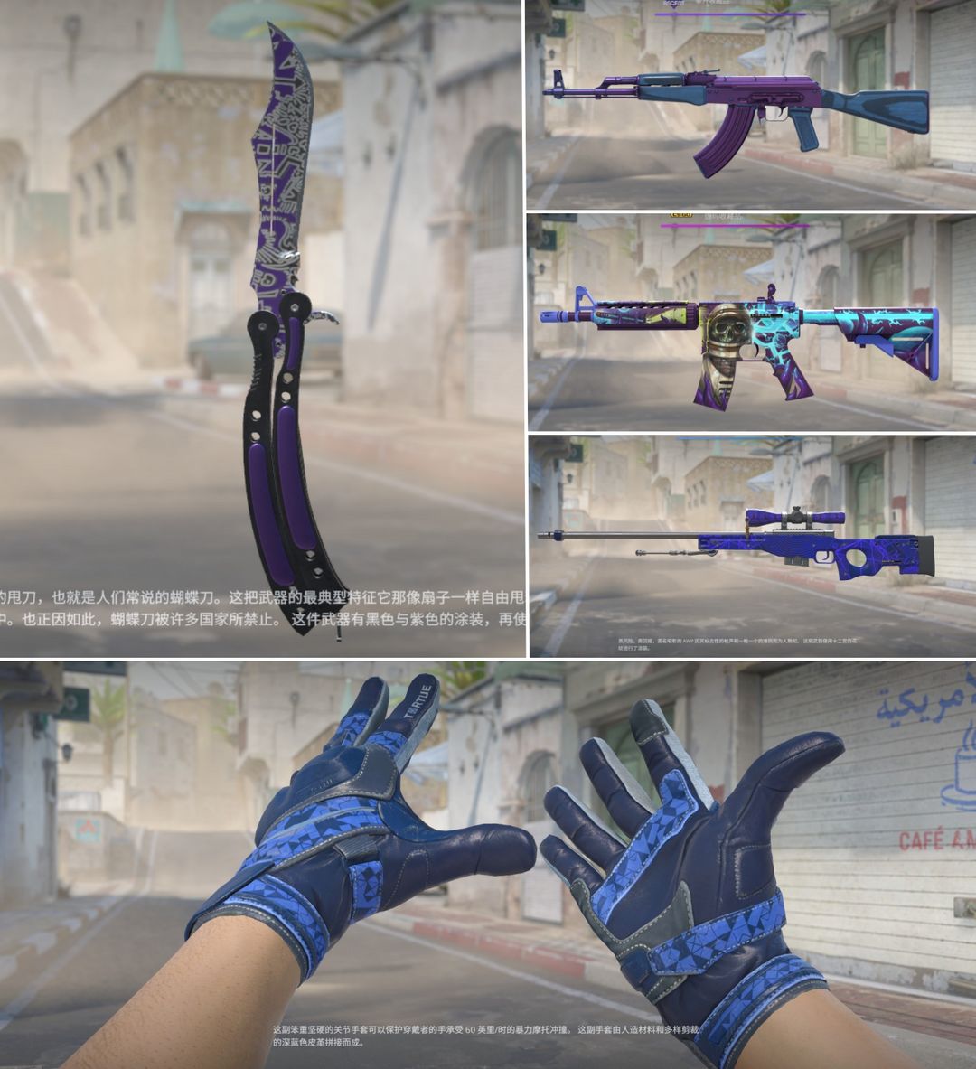 完美A段丨蓝紫套丨蝴蝶刀自由之手丨多边形手套丨狮子之日AWP丨死寂空间M4丨午夜层压板AK