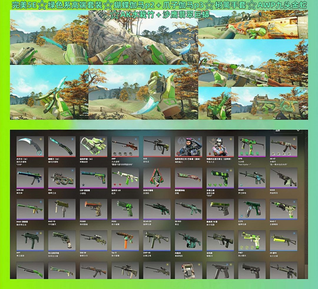 完美5E⭐绿色系高端套装⭐蝴蝶伽马p2+爪子伽马p3⭐树篱手套⭐AWP九头金蛇⭐AK水栽竹+沙鹰翡
